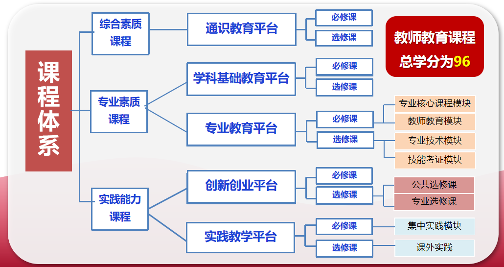 本专业确定了“专业理论课程、专业能力课程、专业素质课程并重,加强员工职前能力培养”的课程设置思路:通过专业理论课程奠定学前教育专业的基础;通过专业能力课程培养职前能力,形成个性和特长;通过专业素质课程促使资格证书获得、能力强化、顶岗实训与就业紧密结合,实现理论、能力、素质一体化的人才培养。基于上述课程设置思路,现行课程体系采用“平台+模块+课程群”的结构形式,由通识教育平台、学科基础教育平台、专业教育平台、创新创业平台和实践教学平台构成。