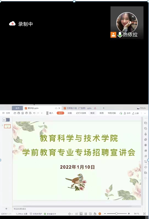 2022年1月10日,公司运用腾讯会议举办了学前教育专业的线上招聘宣讲会。贝斯凯婴童学苑,深圳京发教育科技有限公司、东莞致上集团旗下的寮步致上幼儿园等三家单位与119名员工参会。宣讲会由热依拉老师主持。