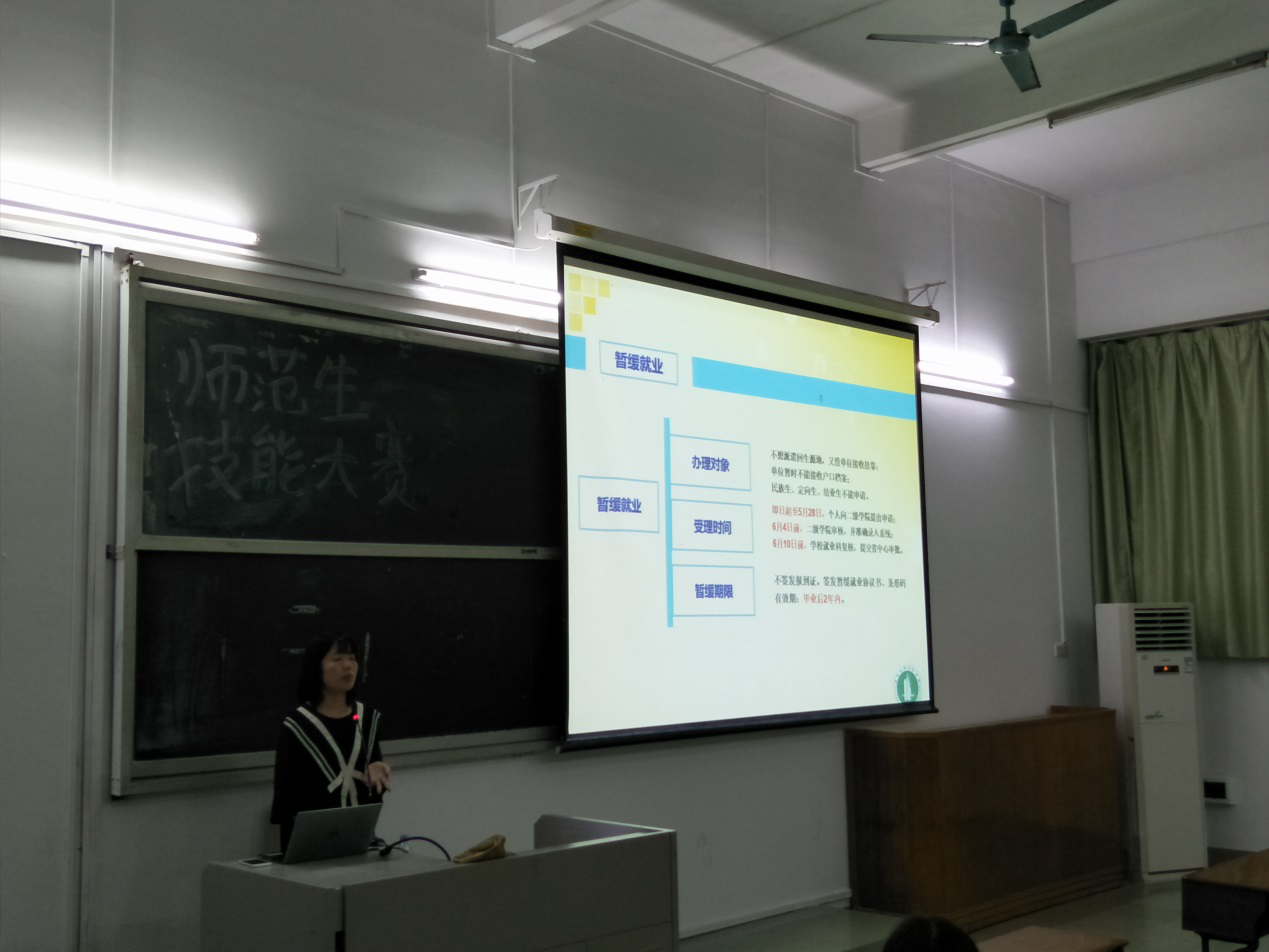 为了进一步加强就业指导的课程建设,更好的为毕业生提供就业指导和帮助,2018年5月11日晚上20:00,公司在本部一教207开展由张琳老师主讲的2018届毕业生就业指导课之就业派遣。参加对象为学前教育(师范)专业和应用心理学(师范)专业的全体大四员工。