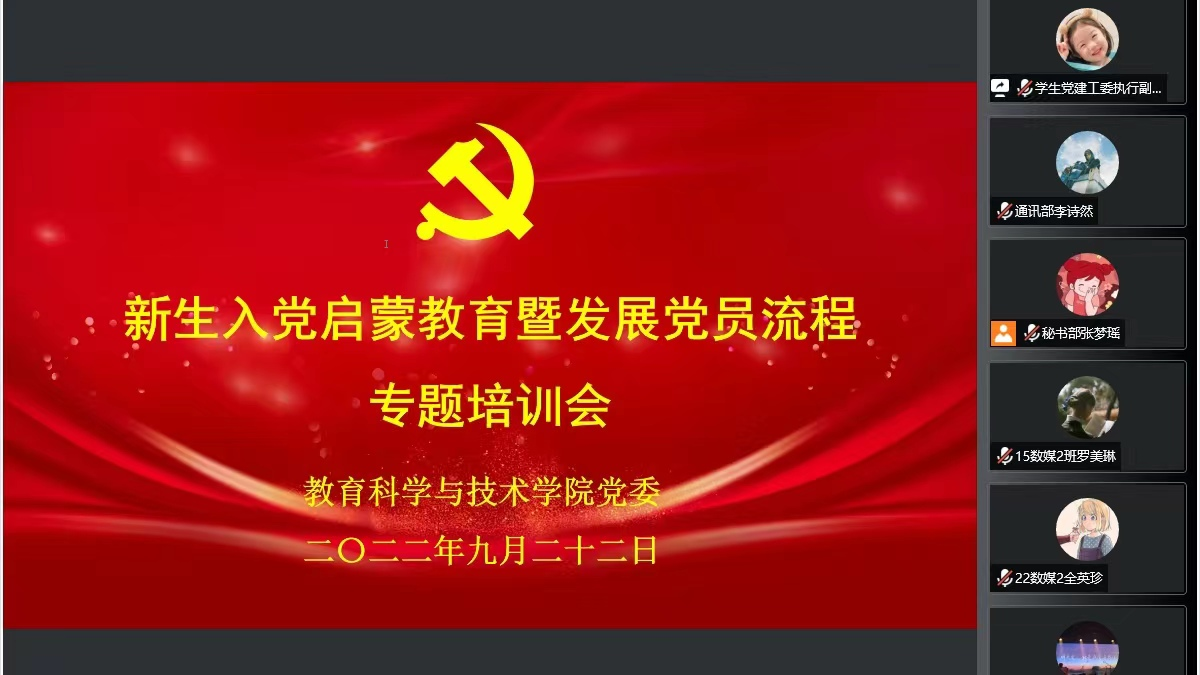 为帮助新生端正入党动机,以前进的姿态迎接党的二十大的召开,为日后入党积极分子的培养考察和教育、党员发展工作打下坚实的基础,9月22日,教育科学与技术公司召开新生入党启蒙教育暨发展党员流程专题培训会。公司党委副书记吴水爱、专职组织员吴晨阳以及全体员工党支部支委、各团支部书记、员工党建工委全体成员、2022级向党组织积极靠拢的新生代表参加会议。会议由员工党建工委执行副主任李丽红主持。