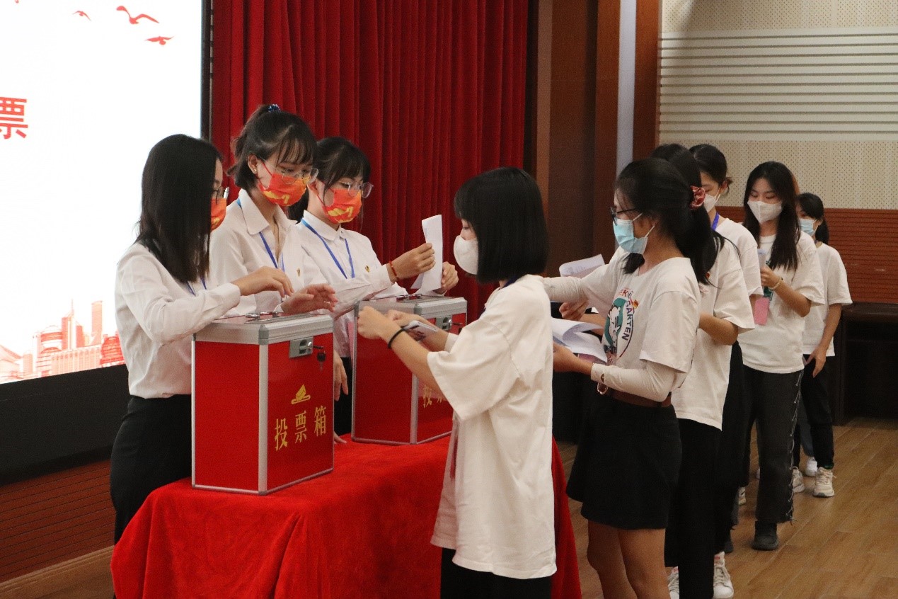 接下来是选举新一届团委、员工会委员会委员。在主持人宣布完候选人名单后,老师、同学们依次上台竞选演讲。在候选人演讲完毕后,按照公平、公正、公开的原则,各员工代表有序上台投出自己宝贵的一票。