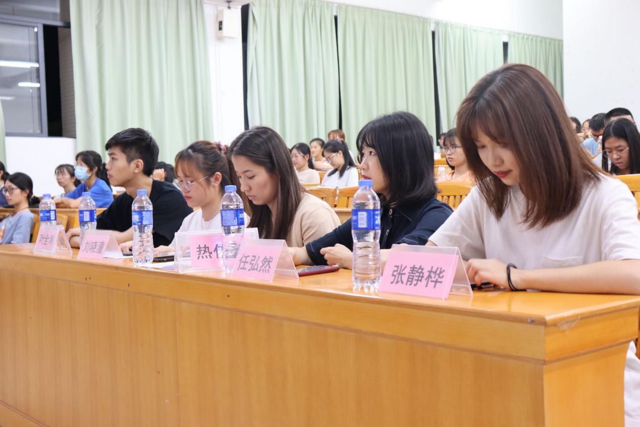 接下来主持人为大家介绍了“一毛钱”爱心计划。“一毛钱”计划即遵循个人意愿,鼓励同学们每天节约一毛钱捐献给阳光爱心基金会去以帮助有困难的同学。接着,辅导员热依拉老师和团委副书记刘晓潼师姐依次发表讲话,鼓励大家献出爱心,帮助有需要的同学。