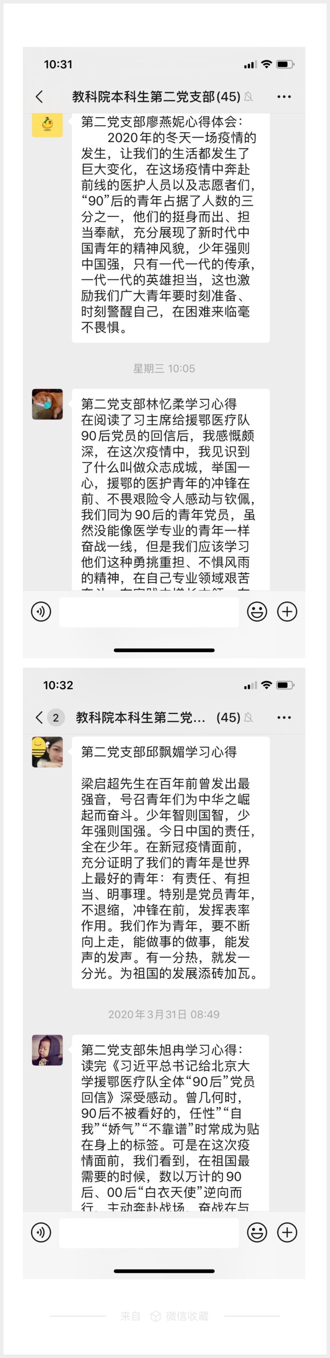 本科生第二党支部90后预备党员吴紫霞同学写道:看完习近平主席给北京大学援鄂医疗队全体“90后”党员的回信后,我既感动又深感惭愧,我感动于习近平主席对这些“90后”青年努力的肯定,感动于这些青年在疫情暴发时,能将生死置之度外,勇敢跻身前线与病毒作斗争,同时,我感到惭愧,作为一名“90”后老员工,我享受了其他人为战胜病毒而付出的努力成果,自己却少有奉献,这次疫情,让我感受到自己在某些方面的无能与软弱,但是,在看完习近平主席的回话后,“90后”党员的精神又激励鼓舞了我,也许我不能在医疗岗位上为群众服务,那我就在未来的教师岗位上做好自己应尽的本分,培养人才,为建设美好中国添砖加瓦。