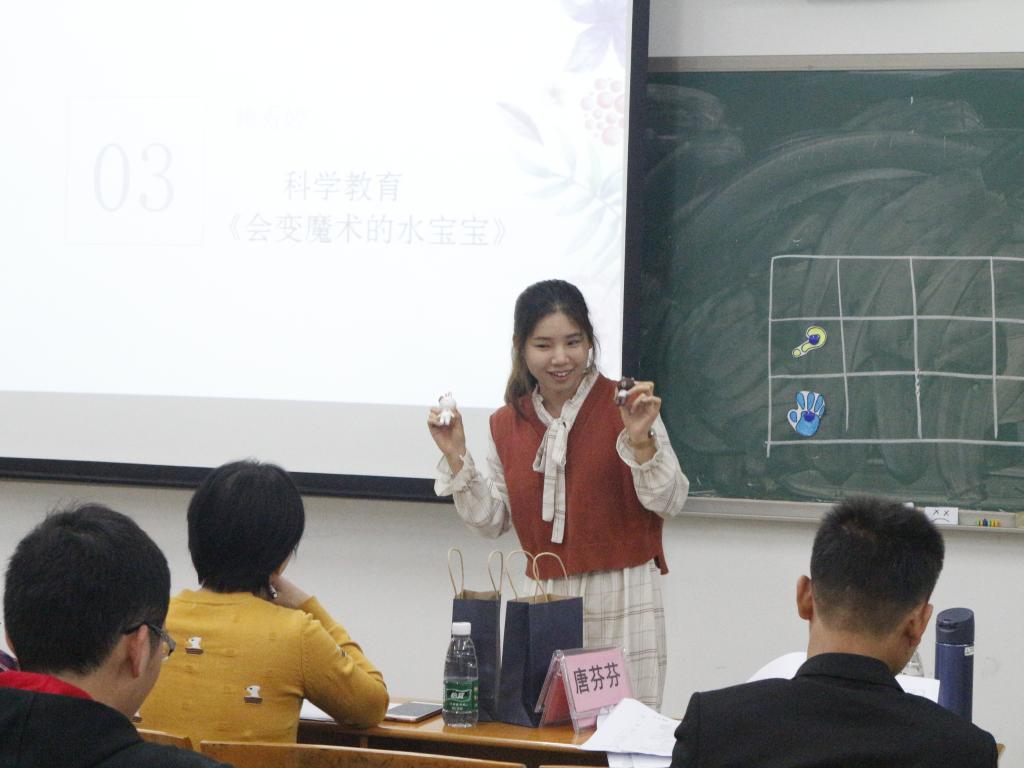 紧接着2019年4月12日晚6点20分,学前教育专业专场在三教512、513揭开序幕。该场比赛赛邀请了孙文云老师、唐芬芬老师、谢新德老师,以及刘红师姐、招淑贤师姐、谢诗韵师姐担任比赛评委。来自不同年级的12位选手各显神通,一场场趣味盎然的课堂享受让人叹为观止。