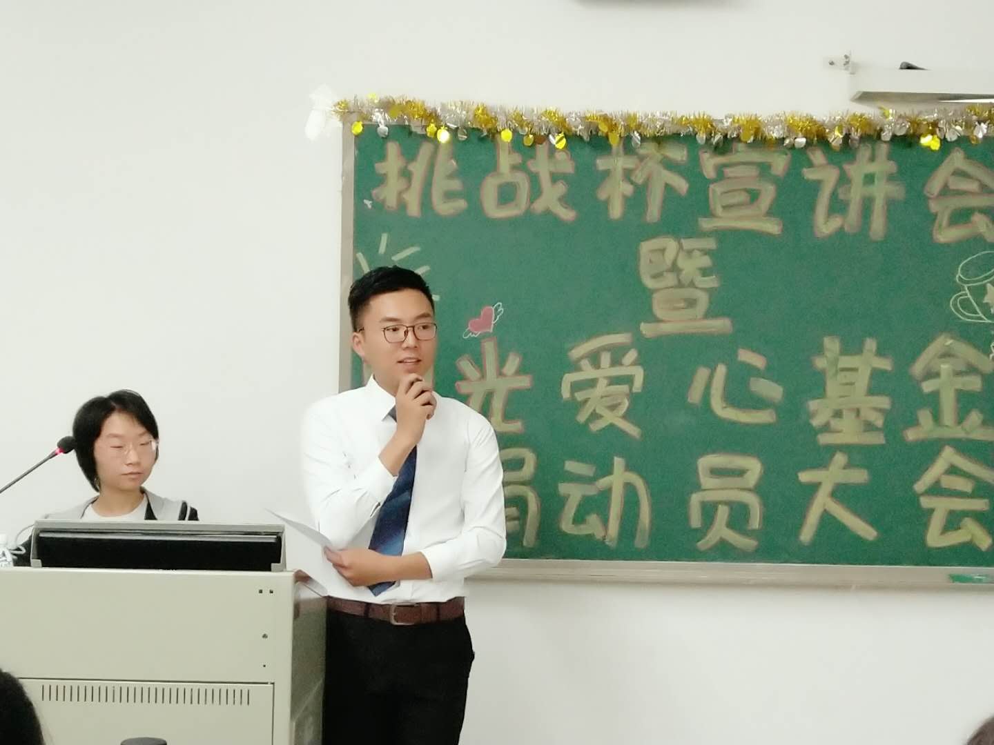 2018年4月18日晚,教育科学与技术公司在二教301课室如期举办了“挑战杯”宣讲会暨阳光爱心基金募捐大会。出席本次活动的嘉宾有党委书记林启词老师、党委副书记吴水爱老师 团总支书记王孜老师、公司往届参加过“挑战杯”的优秀员工、各二级公司团副及公司各年级的员工代表。本次大会有两项议程:一是“挑战杯”宣讲会,二是阳光爱心基金募捐大会。主持人由艺术团司仪队蒙博睿担任。