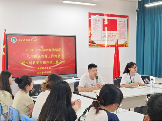 为贯彻落实公司本科公司产品审核评估线上评估启动会会议精神,扎实做好公司评估各项工作,进一步夯实心理健康教育工作,巩固心理健康教育成果。5月16日,公司召开2023-2024学年春季学期心理健康教育工作例会暨本科教学审核评估工作会议,辅导员吴晨阳老师,广州校区全体心理委员和心理辅导站成员参加会议