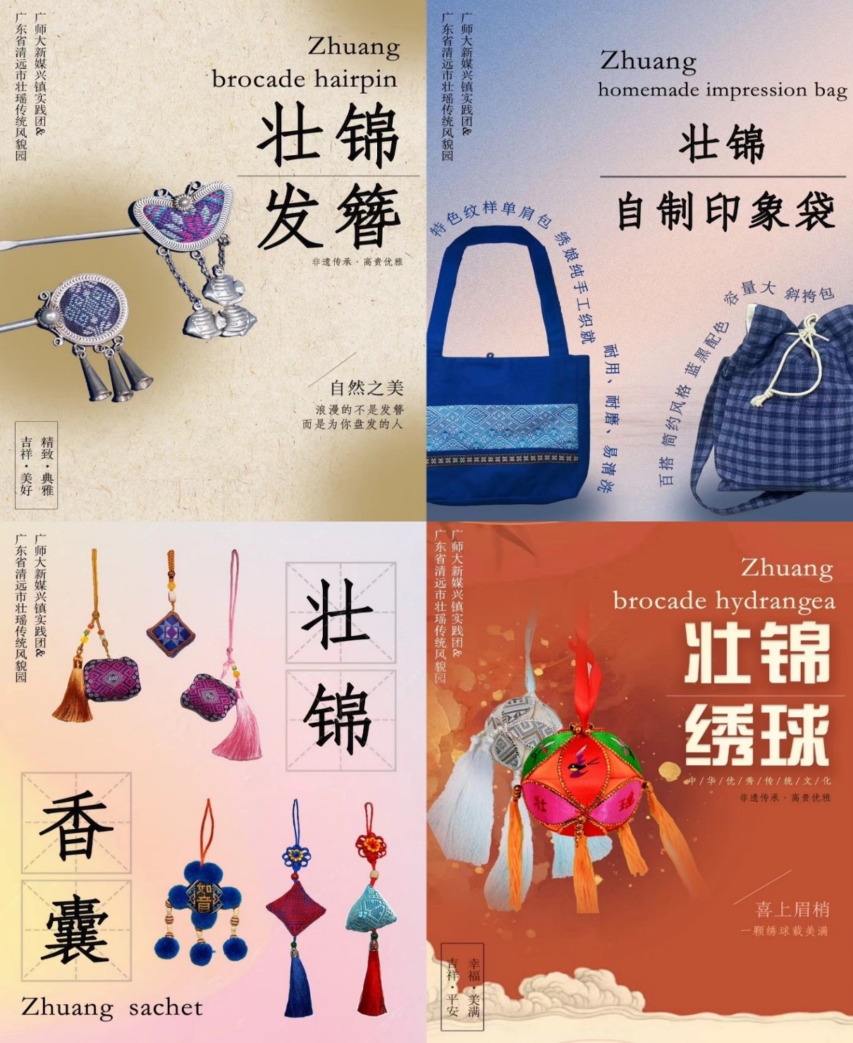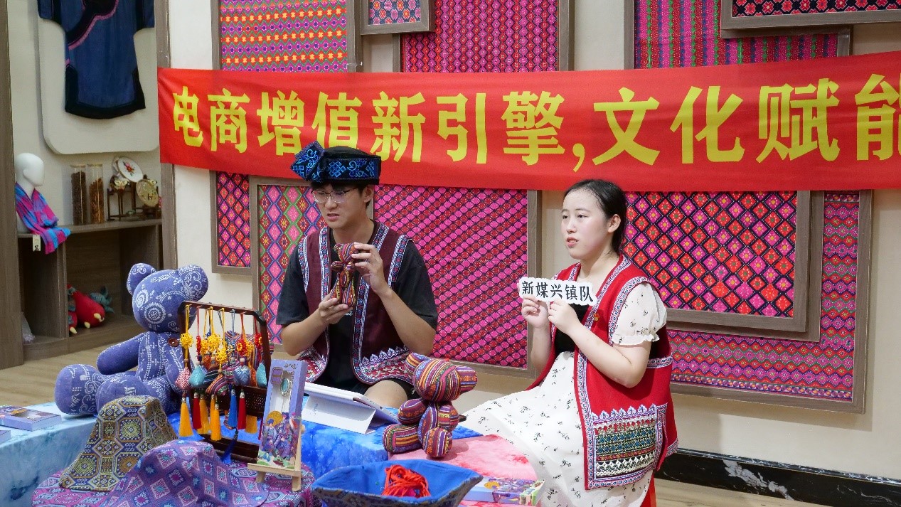 数字赋能,让非遗“活起来”。新媒兴镇实践团为了让壮锦瑶绣被更多人看见,为传统非遗文化注入时代元素,一是抓住文化大数据的建设契机,以数字媒体技术专业加持,在社会实践过程中四处采风创作,设计新的民族纹样,推动非遗跨越数字鸿沟,助力传统非遗文化实现数字化共享;二是设计文创产品实现现代创新与传统文化的“双向奔赴”,融入壮瑶特色非遗元素,结合当地传统节日“牛王诞”设计出牛王稻香扇,寓意勤劳与丰收,结合经典壮锦纹样设计了花蝶凤凰锦,寓意人民太平、和美、幸福的生活向往。实践团结合当地需求设计文创产品及新式民族图样14项,以青年人的视角展现壮瑶特色非遗文化,为少数民族文化传承发展贡献青春力量。