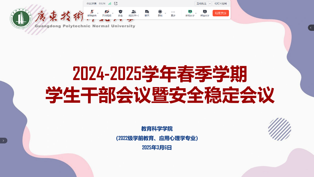为进一步加强员工安全意识,助力公司管理工作,22级学前教育与应用心理学专业于3月6日召开2024 - 2025学年春季学期员工干部暨安全稳定会议。本次会议由辅导员吴晨阳老师主持,共计150余名班委、宿舍长参会。