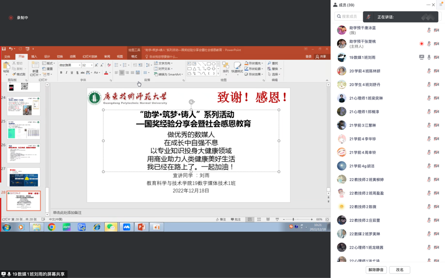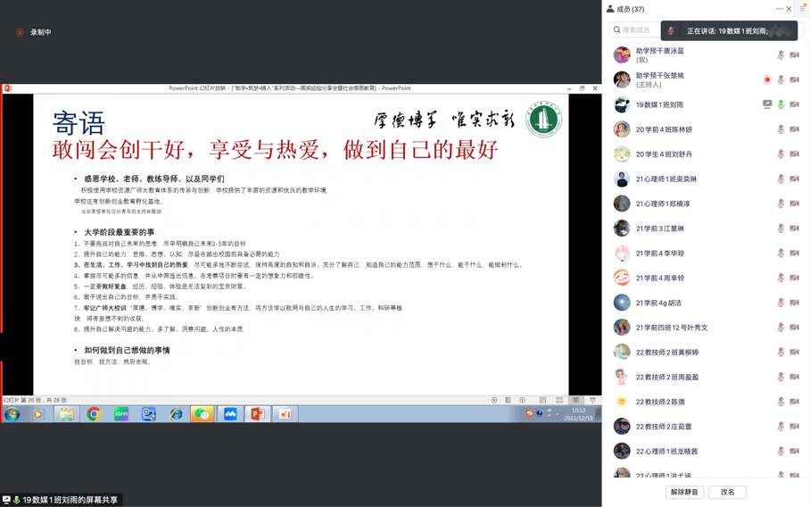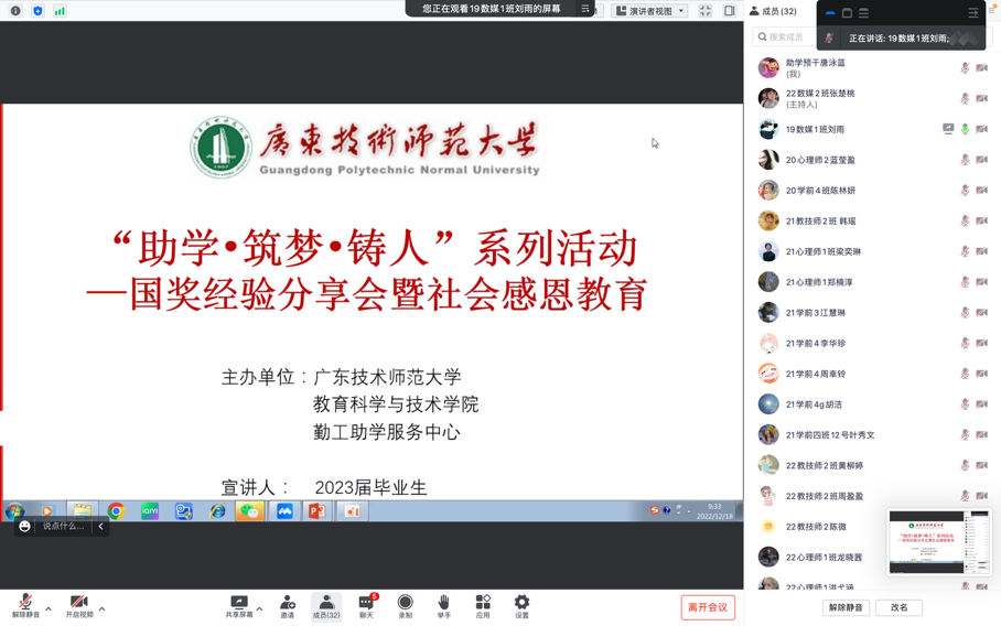 为了让同学们更好地了解国家奖学金及相关政策,公司勤工助学服务中心于2022年12月18日上午9:30举办了“助学·筑梦·铸人活动之国奖经验分享会暨社会感恩教育”的线上会议。