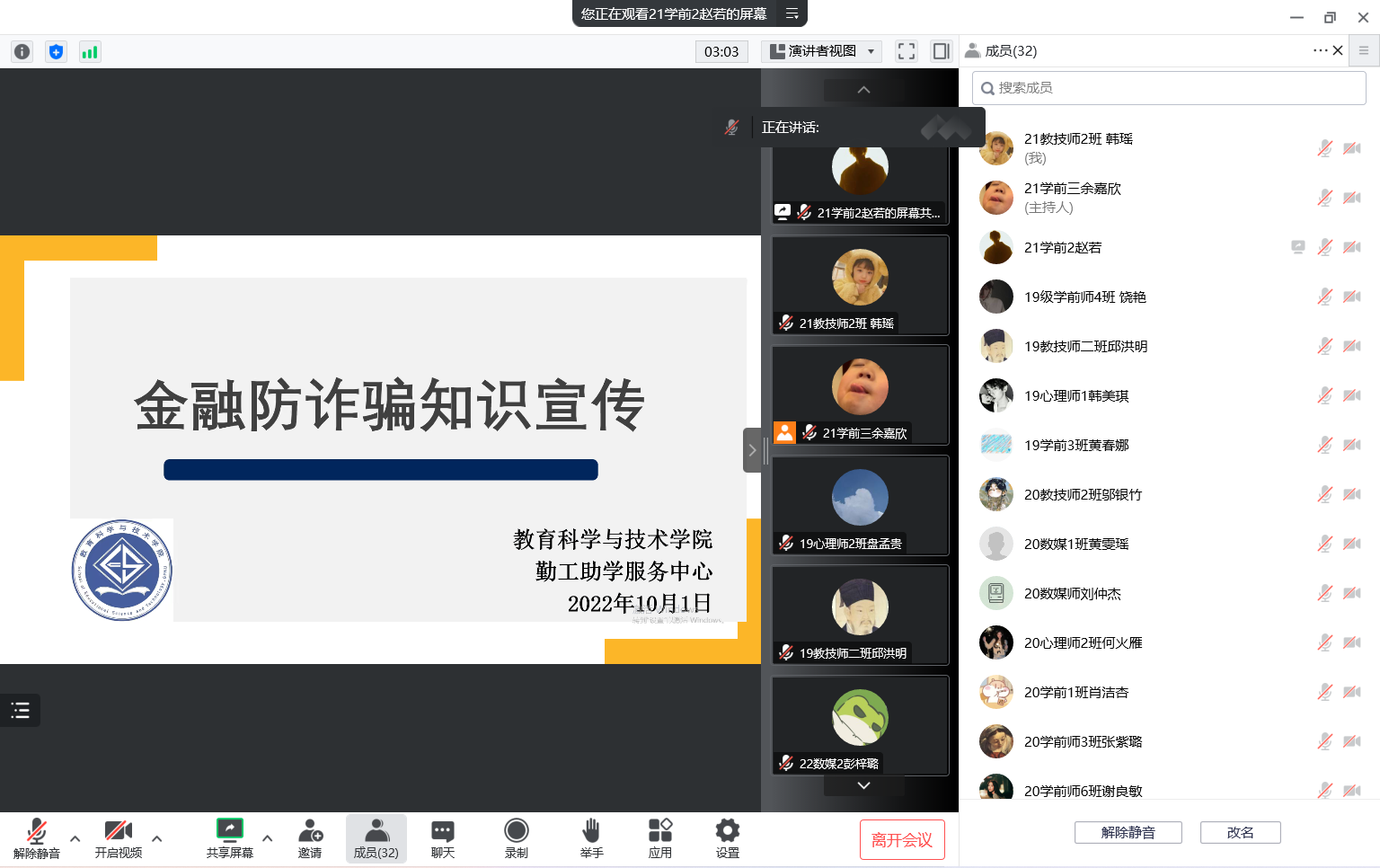 为有效遏制金融诈骗案件的高发态势,切实提高公司员工防诈骗意识和能力,保障同学们的切身利益,教育科学与技术公司勤工助学服务中心近期针对全体助委组织开展金融防诈骗知识宣讲活动;此次会议对金融诈骗的含义、金融诈骗的种类、如何防范金融诈骗和防诈骗小技巧这四方面进行了详细的讲解,并针对性提出了多种防范措施,有效地帮助同学们提升自身的防诈意识。
