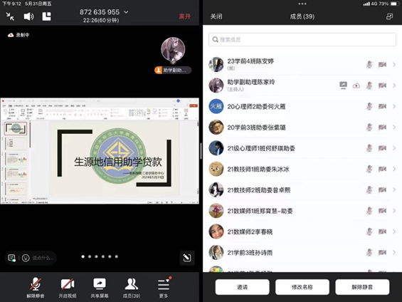 为加大宣传生源地信用助学贷款的助学政策,助力有志员工无忧求知,公司勤工助学服务中心于2024年5月31日晚上21点召开了一次以“生源地信用助学贷款”为主题的线上会议。本次会议主要围绕介绍生源地助学贷款的基本政策、贷款申请的条件、申请流程、温馨提醒以及诚信教育等5个方面进行宣传,既增进助学委员对生源地信用助学贷款的了解,也为今后助学委员服务同学和协助勤工助学服务中心工作的顺利进行提供了有力的保障。