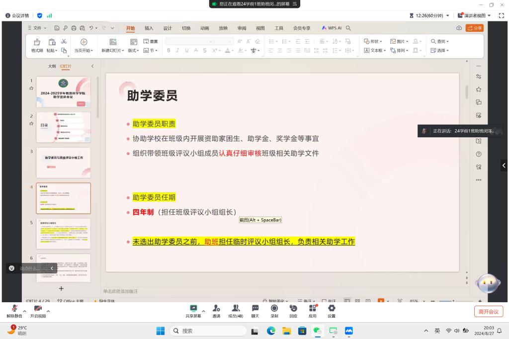 为推动2024—2025学年新生助学资助工作顺利推进,使新生全面了解资助相关事宜,公司勤工助学服务中心对助班进行培训并组织助班于2024年8月27日通过线上会议的方式,给各班新生召开了“2024-2025学年新生助学资助工作宣讲会议”。本次会议主要分为四个部分,分别是助学委员和班级评议小组工作、家困生认定申请工作、国家助学金和国家励志奖学金申请以及资助政策了解渠道。通过此次会议,新生对助学资助有了更清晰的了解,也进一步推动了公司新学年助学工作的顺利开展。