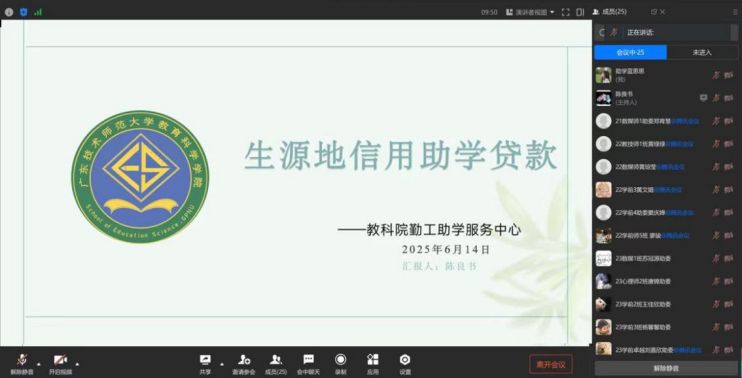为加大生源地信用助学贷款宣传,推动生源地信用助学贷款政策精准传导致各班级,公司勤工助学服务中心于2025年6月14日晚上19点召开了以“生源地信用助学贷款”为主题的线上会议。本次会议分别从生源地信用、贷款申请条件、申请流程及申贷材料、续贷流程及续贷材料、还款计划、常见问题以及个人征信7个方面展开系统讲解。