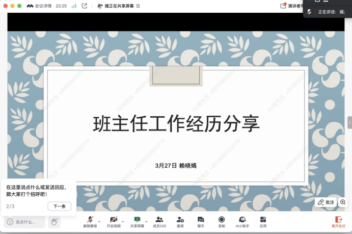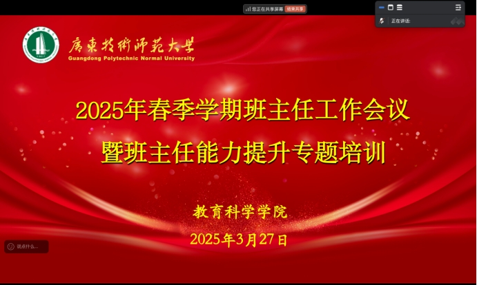 会上,2023-2024学年优秀班主任代表赖晓嫣、梁碧珊老师分别进行工作经验交流,两位老师以班主任视角,向与会老师细致阐述了各自在班主任工作中的实践举措、深刻思考以及宝贵经验。赖晓嫣老师主要从归属感、成就感、幽默感三个方面进行分享,梁碧珊老师从建设班级凝聚力、提升专业认同、关爱特殊员工和助力未来规划等方面展开。随后,吴晨阳老师结合《BV伟德官方网站班主任工作实施办法》(广师大〔2020〕268号)文件,从班主任工作要求与岗位职责、员工管理与心理辅导、意识形态安全和校园安全教育、班主任考核和员工宿舍公约五个方面展开解读,明确了班主任在促进高校班级建设与管理中的积极作用和育人方向。