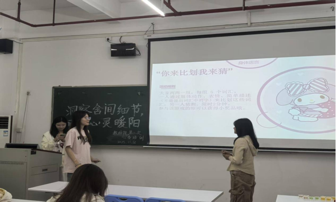 同时,为进一步提升心理委员的专业素养和工作水平,筑牢校园心理健康防线,心辅站于11月16日在白云、河源校区同步组织开展以“洞察舍间细节,呵护心灵暖阳”为主题的心理委员培训。白云校区通过“心”线索侦探游戏、“你比划我来猜”互动、影视片段分析,锻炼心理委员识别负面情绪、微表情及心理状态的能力。河源校区则先开展系统性的心理知识讲解,再结合多个互动小游戏,提升心理委员发现、解决心理问题的实际能力。