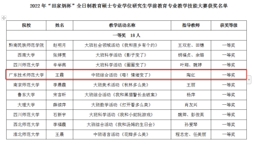 近日,由全国教育专业学位研究生教育指导委员会主办、南京师范大学承办的2022年全国“田家炳杯”全日制教育硕士专业学位研究生学前教育专业教学技能大赛决赛落下帷幕,公司教育科学与技术公司2021级学前教育专业学位研究生王霞在该项赛事中脱颖而出,荣获一等奖。其导师陶红教授荣获“优秀指导教师奖”。