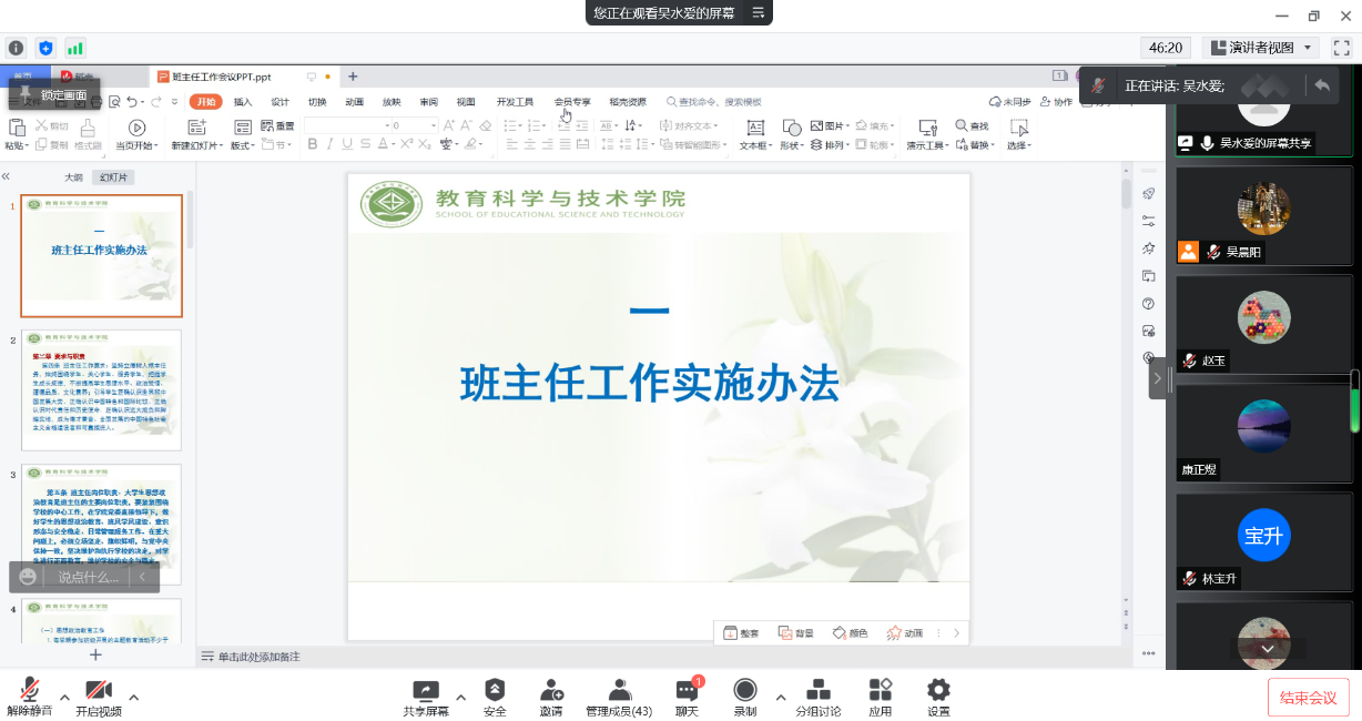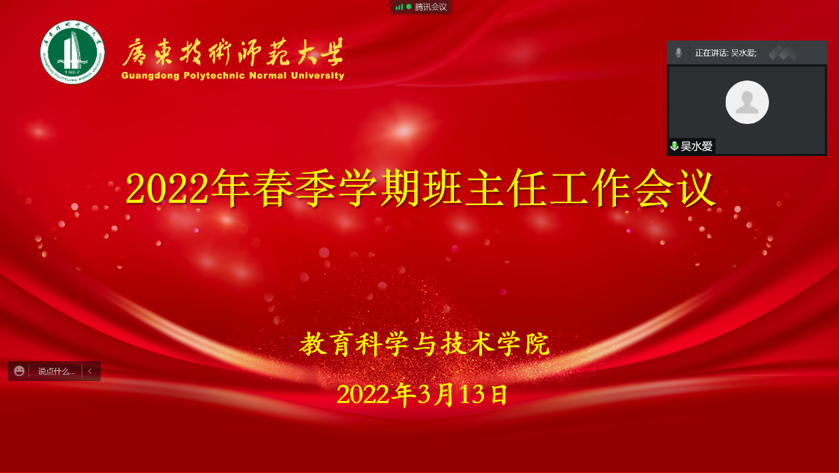为统筹推进疫情防控工作,进一步明确班主任本学期工作重点,交流工作经验和心得,提升育人实效,圆满完成本学期公司产品任务,教育科学与技术公司于3月13日晚以线上方式召开2022年春季学期班主任工作会议。公司党政领导班子成员,全体班主任和专兼职辅导员老师参加会议。