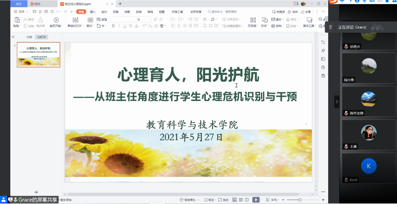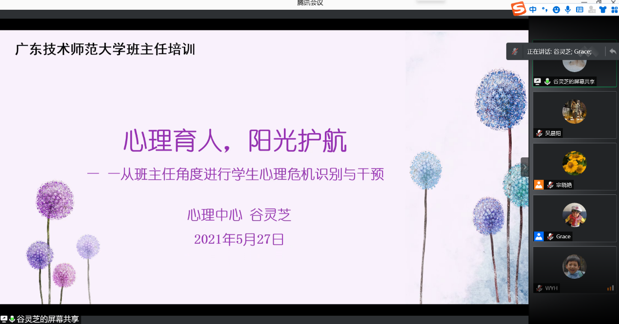 为了帮助公司班主任老师更好地把握老员工心理发展规律,敏锐识别可能出现的心理问题,掌握快速处理心理危机的方法,有效提升心理育人的工作水平,5月27日晚教科公司党委邀请了公司心理健康教育与咨询中心的谷灵芝老师为大家开展了以《心理育人,阳光护航——从班主任辅导员角度进行员工心理危机识别与干预》为主题的线上讲座,教科公司党委书记张旭日、经理陶红、党委副书记吴水爱及全体班主任和辅导员老师参与了此次会议。