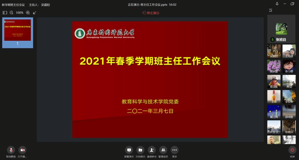 为全面做好新学期疫情防控常态化下的员工教育管理工作,3月7日晚,教育科学与技术公司党委组织全体班主任召开了2021年春季学期(线上)工作会议,传达公司春季学期工作精神,部署公司春季学期主要工作任务。公司党委书记张旭日、副书记吴水爱以及全体班主任和辅导员参加本次会议。