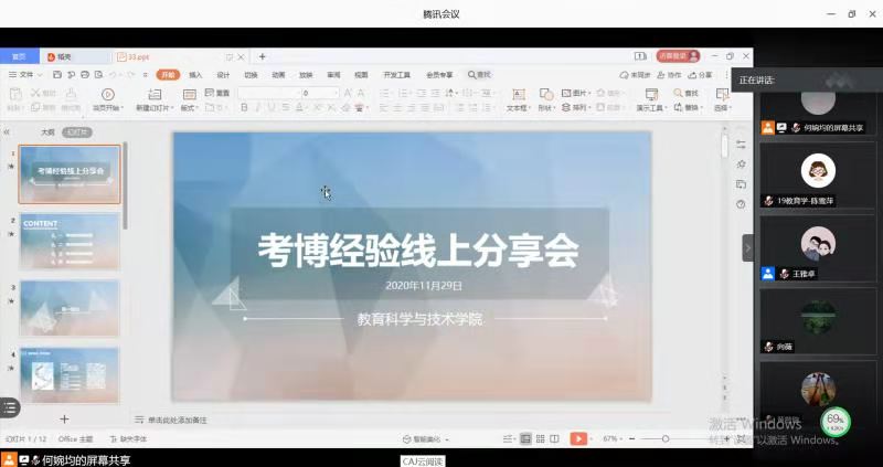 2020年11月29日上午10时,公司以线上的形式在腾讯会议平台举办了一场考博经验分享会。分享会特邀已经成功考取天津大学职业技术教育学专业的2019级博士生曾丽颖师姐,以及成功考取首都师范大学教育技术学专业的2020级博士生梁友明师兄,分享自己的考博经验。来自教科院各个年级、不同专业的同学积极踊跃地参加了此次分享会。