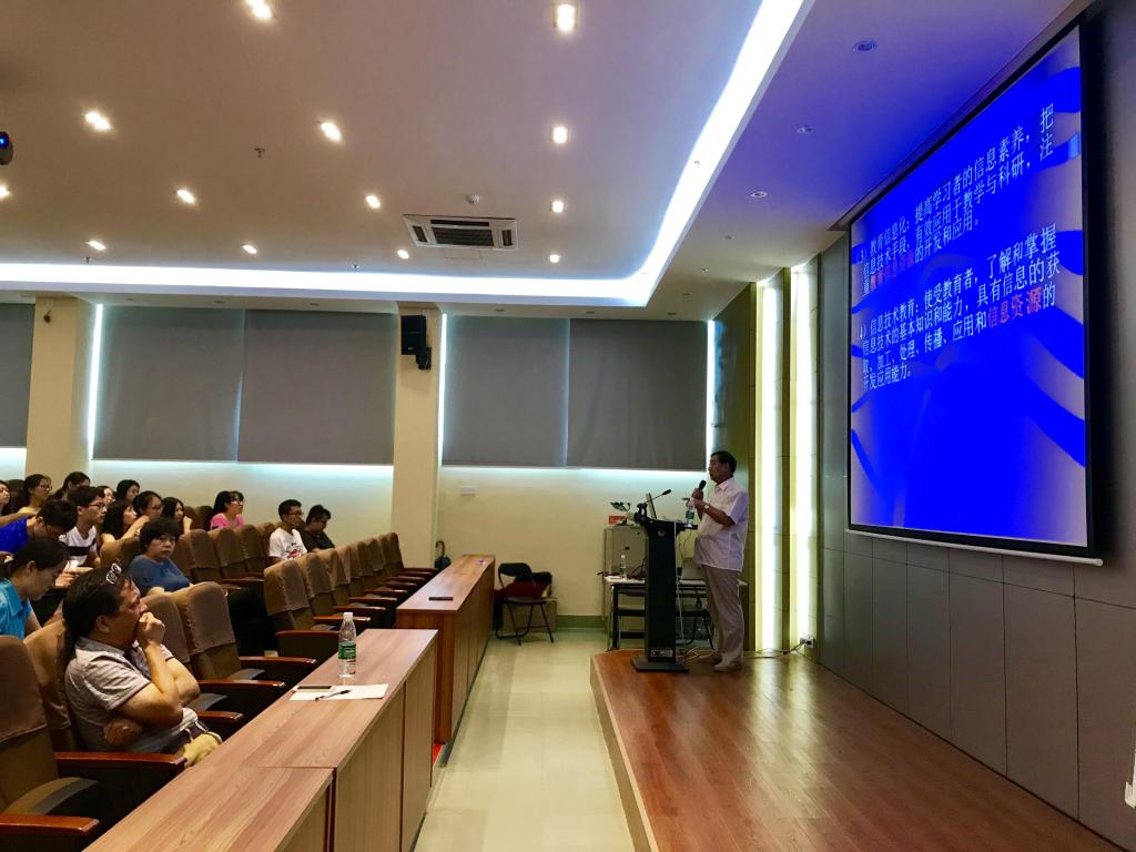 并就互联网与“互联网+教育”的联系与区别作了详细介绍。杨教授指出,在“互联网+教育”时代,传统的“授课”模式逐渐消失,个性化学习出现,教育模式更加互联网化。因此,要善于开发数字教育资源,提供各种网络化教育服务,通过尝试MOOC、创客空间、翻转课堂等先进教学手段,将现代化技术手段融入课堂教学,从而提高课堂教学效率。