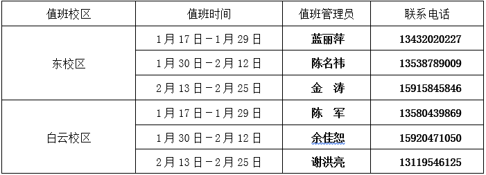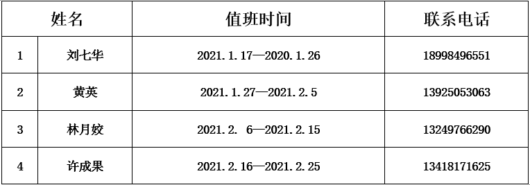 寒假时间为2021年1月17日至2月25日,期间实验室将不对外开放,实验设备一律不外借。公司由院领导干部带班并根据疫情防控相关工作需要,及时调整值班方式和值班时间。寒假期间实验中心值班安排情况如下: