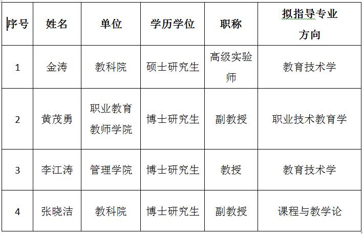 根据《BV伟德官方网站研究生导师遴选办法》(广师大〔2020〕214号)以及《教育科学与技术公司学术学位研究生导师遴选工作实施细则》,经个人申请、公司审核和公司学位评定分委员会审议表决,现将公司2021年学术学位硕士研究生拟新增导师名单公示如下: