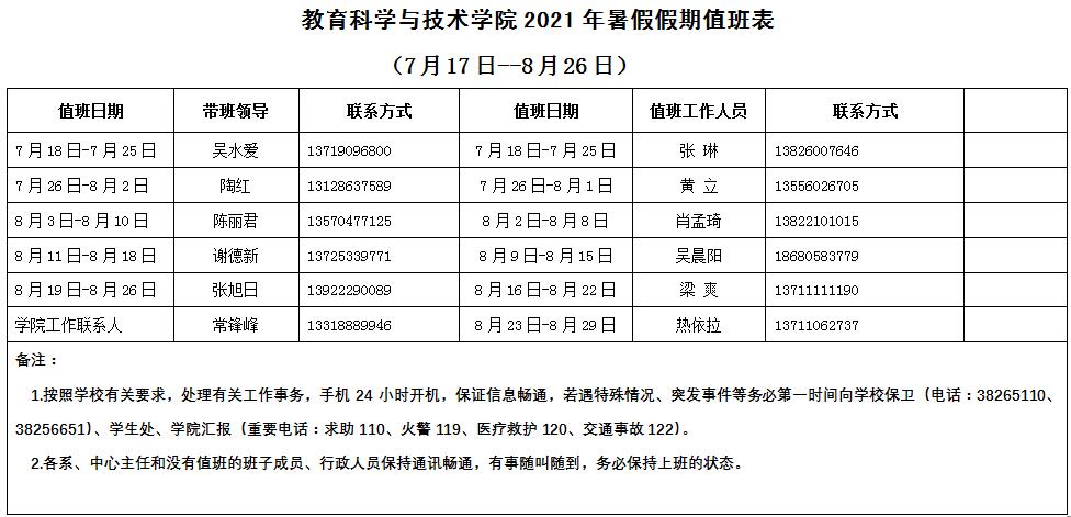 (二)、教师放假时间为7月17日至8月26日,8月27日(星期五)正式上班, 教科院班子成员8月27日上午8:30开会,全体教工10:00在东校区实验楼107集中开会。8月30日(星期一)开始上课。