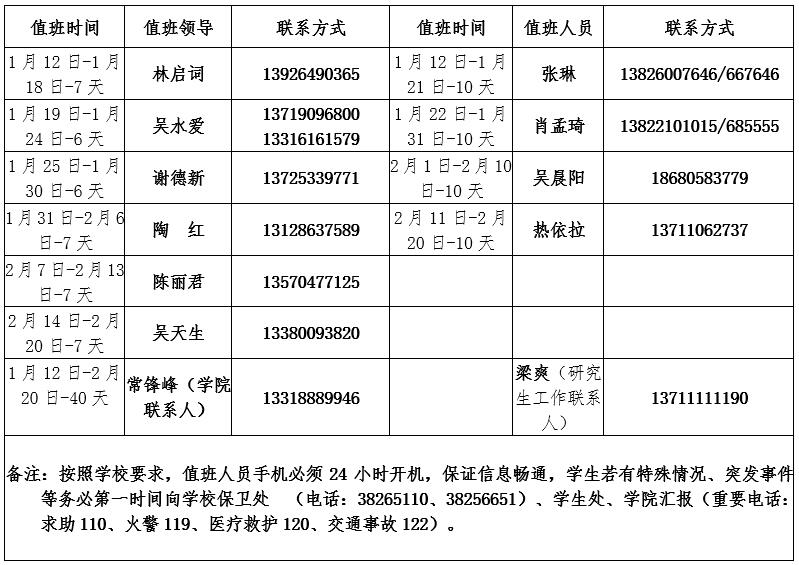 根据公司放假安排,教师放假时间为2020年1月12日至2月21日。寒假期间,实验室将不对外开放,实验设备一律不外借。寒假期间实验中心的值班安排情况如下: