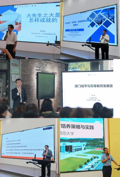 由广东开放大学粤港澳大湾区名人与大学文化研究中心主任罗海鸥研究员做了题为“大先生之大是怎样成就的”的精彩报告。广东培正公司董事长黄葳教授做了题为“高水平职业院校“双师型”教师发展路径问题”的报告。教育部长江学者讲座教授李子健教授做了作了题为《粤港澳大湾区脉络下的职业教育课程发展》的报告;澳门城市大学研究生院副经理周龙副教授作了题为《澳门城市与高等教育发展史》的报告。华南师范大学职业教育公司经理刘志文教授作了题为《职业院校产教融合人才培养策略与实践》。报告不仅丰富了参会师生的知识储备,也帮助同学们开拓了视野,为推进双方研究生教育高质量内涵式发展贡献了力量。