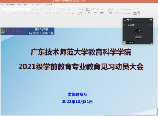 BV伟德官方网站学前教育系于2023年10月31日晚上7点成功召开了2021级学前教育专业师范生教育见习动员会。与会人员包括全体教育见习指导老师、2021级见习小组组长、2021级各班班长和学委。会议由学前教育系主任黄茂勇主持。