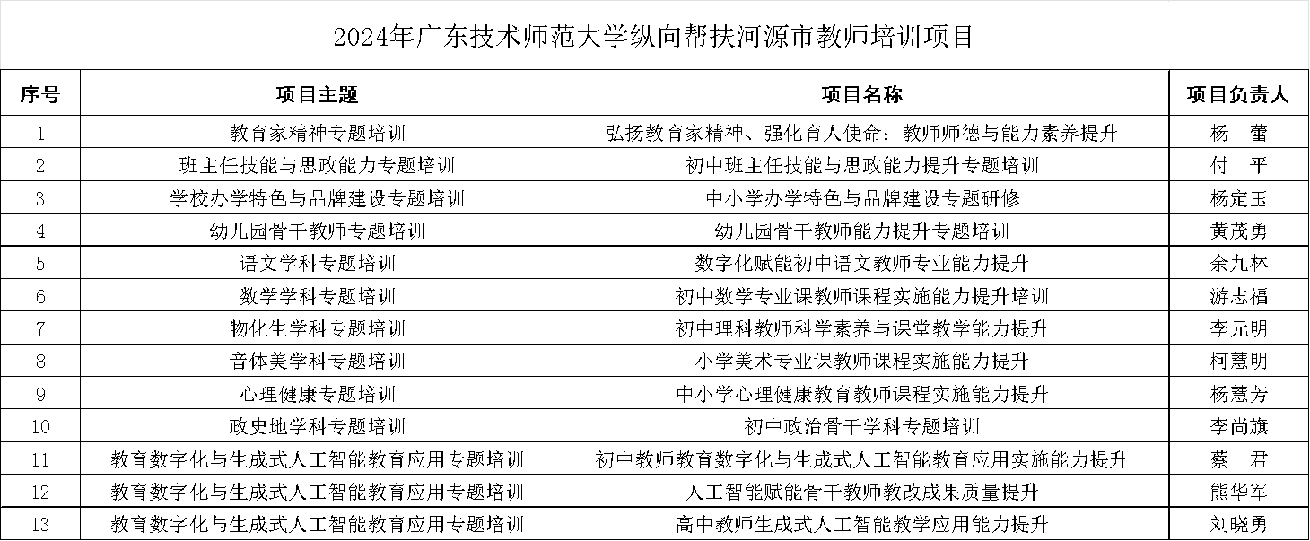 本系列培训旨在通过系统化的课程设计和实践指导,帮助教师掌握先进的公司产品理念和方法,全面提升河源市全学科教师的教学能力。培训开展前进行了充分的需求调查分析,各培训项目团队根据教师需求和单位培训条件,科学申报培训项目和制定项目培训方案。经校内征集、专家评审和校内公示,共资助开展了13个培训项目,包括语文学科、数学学科、美术学科、物化生学科、心理健康和教育数字化与生成式人工智能等多个专题。各项目团队负责人都具有副高以上职称,拥有丰富的学科教学研究和培训经验。