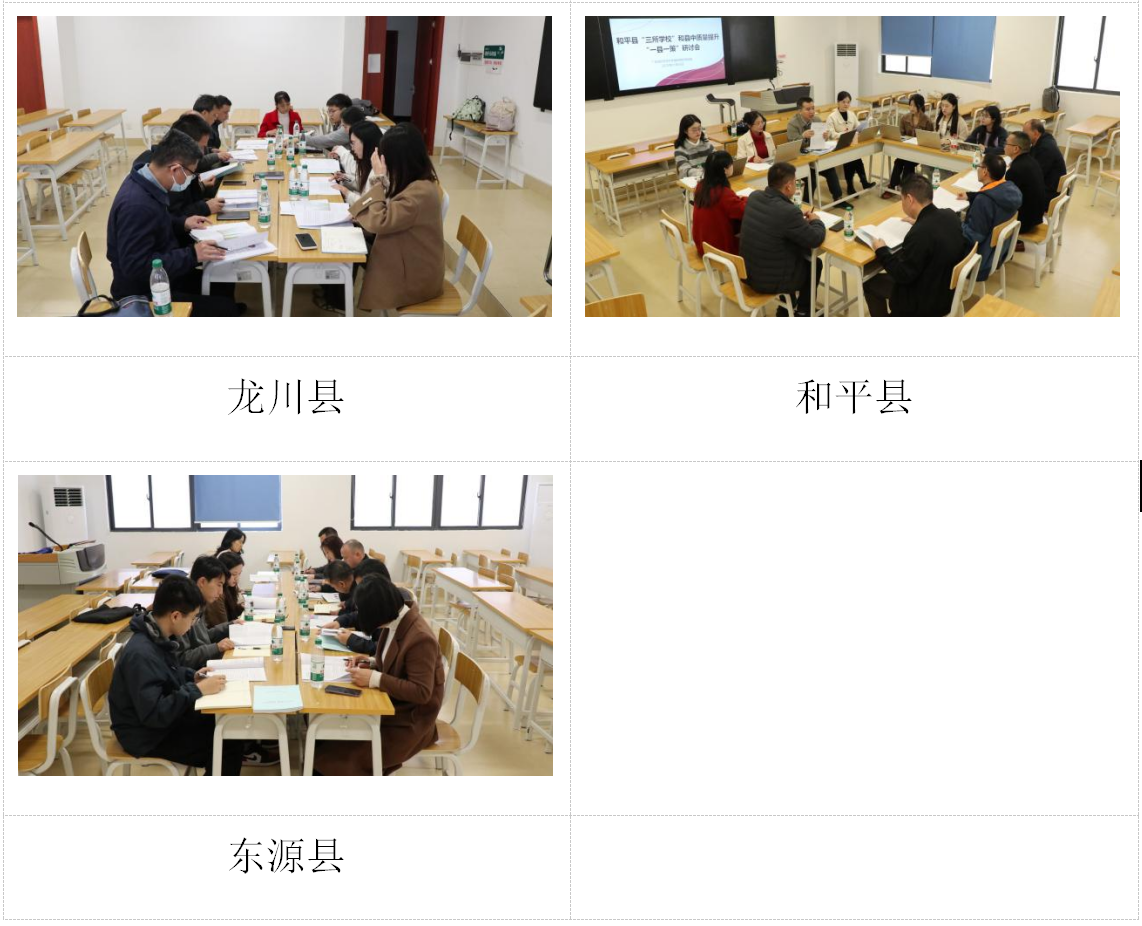 会议结束后,广师大工作团队分别与河源市五县二区教育局有关领导等分别进行“一县一策”调研报告研讨会,就广师大有关调研成果及政策咨询报告进行“一对一”分析与研讨,共同对各区县教育发展“问诊把脉”,探索实施更加可行的帮扶方式或项目,为下一步继续深入推进河源市“三所公司”和县中教育高质量发展赋能和助力。
