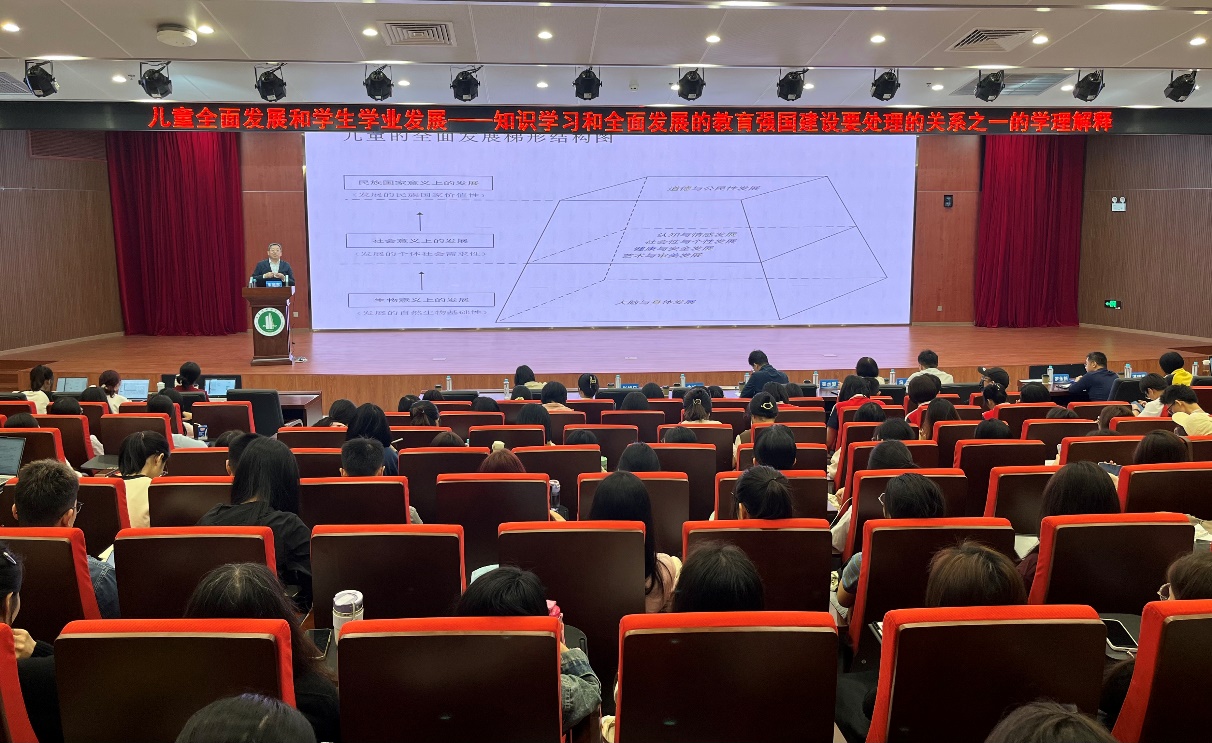 报告中,朱教授围绕“儿童的全面发展”“‘学术学科’和‘科目学科’的二元性”以及“儿童健康发展和儿童学业发展的互促性”三个方面进行深入分析,引导师生从全面发展的视角思考为党育人的问题、从学业学习的视角思考为国育才的问题。