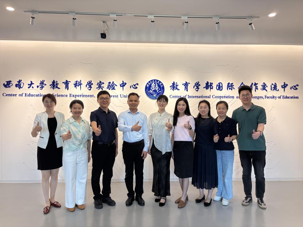 6月5日,谢德新副经理一行赴西南大学教育学部学习调研。西南大学教育学部副部长王正青、学前教育公司副经理余璐、学前实践课程教研室主任王伟参加座谈会。会上,西南大学教育学部余璐副经理对公司领导、老师们的到访表示热烈欢迎,并简要介绍了教育学部和学前教育专业的概况和学前教育专业的历史沿革,并详细介绍了人才培养体系和专业建设举措。与会双方围绕学前教育专业人才培养方案修订、实习实训基地建设、员工深造与就业支持、托幼一体化背景下专业改革与应对策略等话题,展开了深入的交流与研讨,现场气氛真诚、热烈。参会人员实地走访了教育学部的多个实训室和基础设施,就实训课程设计、设备管理与团队建设等进行了现场交流。会后,谢德新副经理一行赴西南大学实验幼儿园进行调研。园长就区域活动、国家级特色课程等做了介绍。