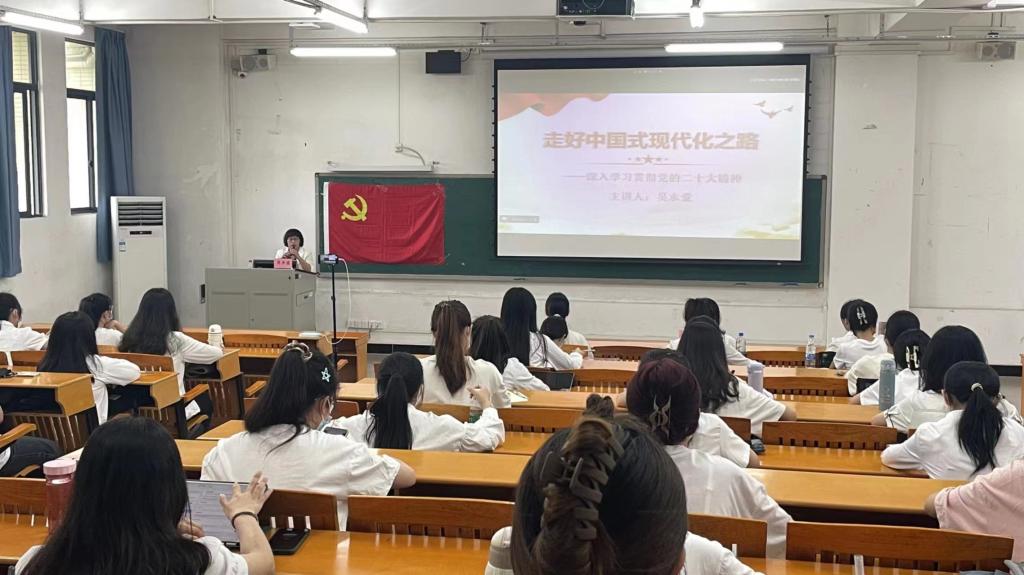 吴水爱副书记以《走好中国式现代化发展道路——深入学习贯彻党的二十大精神》为主题,从九个数字速读二十大报告,坚持奋斗、追求千人的梦想,立足国情、开创中国式现代化,凝心聚力、推进中华民族伟大复兴等四个方面分别展开讲解。她详细讲解了党的二十大召开的历史地位与历史意义,并希望学员们能够深入学习党的二十大报告,理解二十大精神,在平时工作学习中也要多读、多看、多学党的理论知识。随后,她联系理论与实际,从五个方面重点讲述了如何开创走好中国式现代化发展道路,同时强调中国式现代化的本质要求,强调要从物质意义上的现代化、以人为中心的现代化、制度方面的现代化三大层面深刻把握、准确理解中国式现代化。她希望同学们在学习过程中与自身的生活联系在一起,努力上进,按照一名党员的标准严格要求自己。