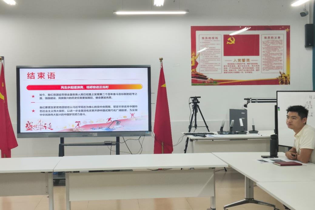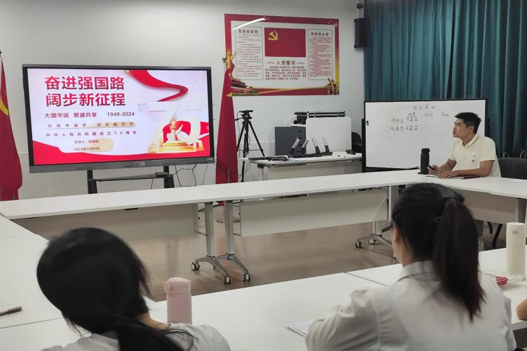 随后,支部书记吴晨阳老师以《奋进强国路,阔步新征程》为主题开展专题党课,他简要回顾了75年来新中国的光辉历程,并带领大家深刻认识75年来在中国共产党的坚定领导下取得的巨大成就,重点围绕党的二十大和二十届二中、三中全会精神,详细阐述中国式现代化新篇章,他号召大家要更加紧密地团结在以习近平同志为核心的党中央周围,坚定不移高举中国特色社会主义伟大旗帜,以进一步全面深化改革开辟中国式现代化广阔前景,为实现中华民族伟大复兴的中国梦而团结奋斗。一是要深刻领会习近平总书记在庆祝中华人民共和国成立75周年招待会上的重要讲话精神,团结一心,不断发扬艰苦奋斗的优良作风;二是要在厚植爱国主义情怀上下功夫,以模范带头作用讲好新中国成立75年来的辉煌成就;三是要勇于担当,扎实自身专业技能,用实际行动践行爱国情怀,为祖国的繁荣富强贡献磅礴力量!