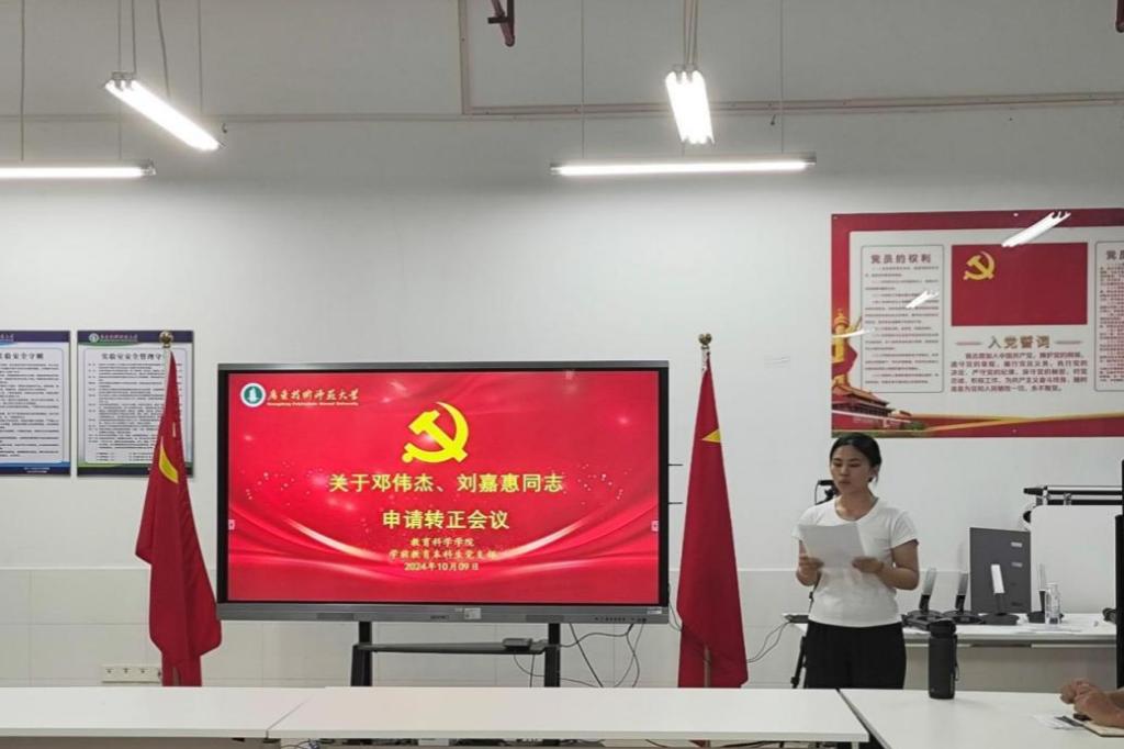 2024年10月9日,学前教育本科生党支部在白云校区二训502会议室举行了预备党员申请转正会议暨支部书记讲党课活动。支部书记吴晨阳老师出席会议,全体支部成员参加会议。本次会议由学前教育本科生党支部副书记林纯同志主持。