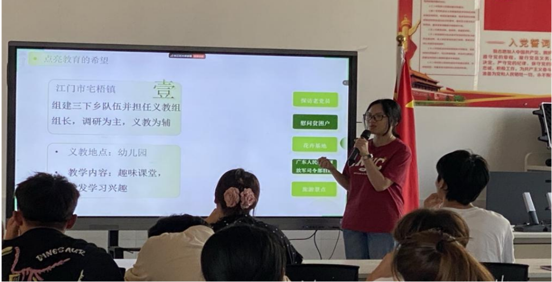 教育技术学本科生党支部易慧欣同志则在“三下乡”经验分享中,讲述自己参与“三下乡”活动的所见所闻、所感所悟。她提到在乡村教育帮扶过程中遇到的困难与挑战,以及团队如何克服困难,为乡村教育注入新活力。这些经历不仅展现了青年员工的担当,也为其他同学提供了参与社会实践、助力乡村教育的借鉴。