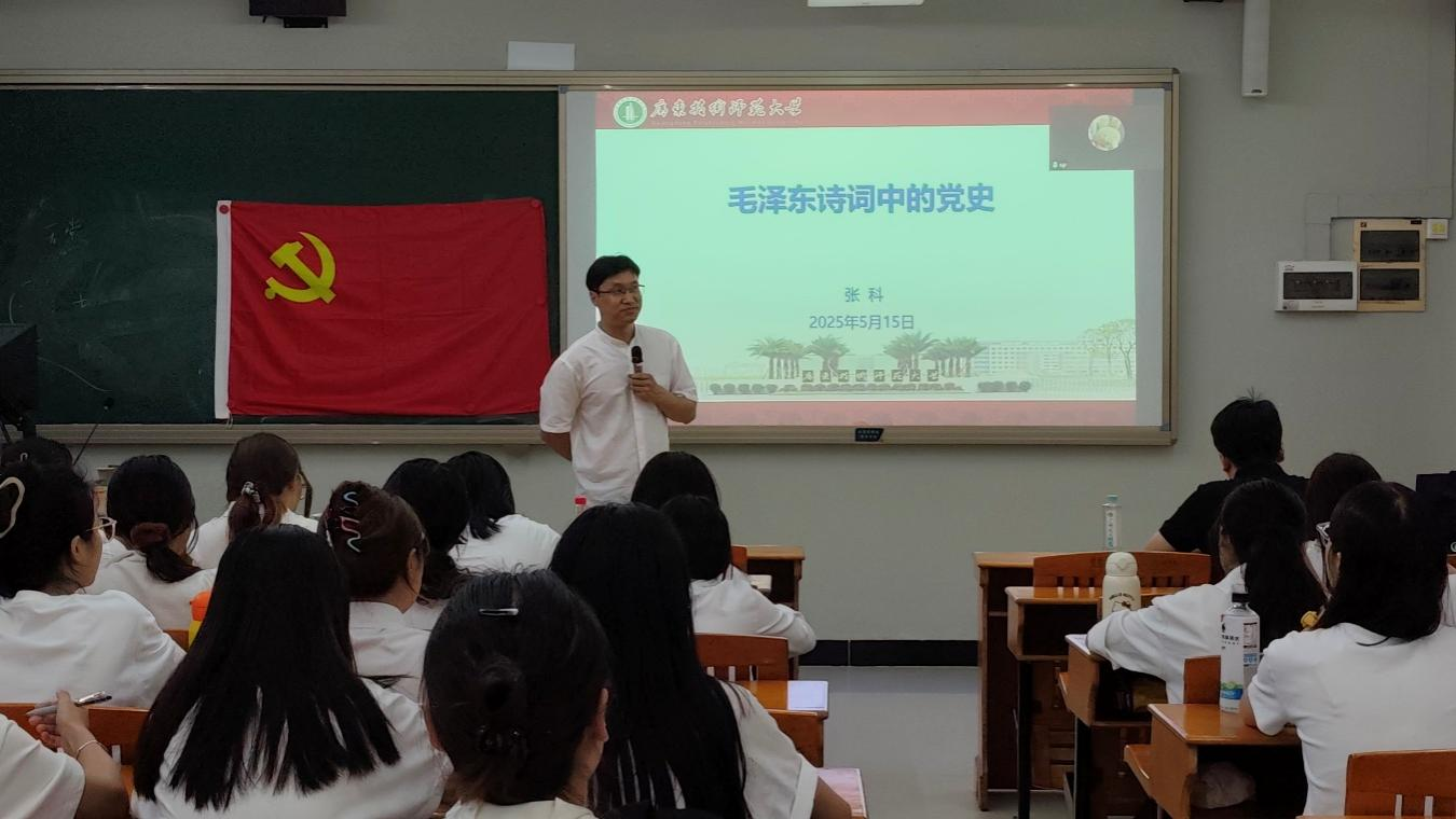 课堂中,张科以毛泽东诗词为切入点,按照“诗史合一、以诗学史、以史明智”这一全新的思路解读党史。在介绍毛泽东青年时期所作的《七绝·改西乡隆盛诗赠父亲》时,高度赞扬了毛泽东的宏伟志向和坚定理想。分析《沁园春·长沙》的革命背景,点明毛泽东发出“谁主沉浮”呼声下对革命道路的探索,反映革命大背景下青年“改造中国,改造世界”的毕生追求。强调三次民众的大联合工作对毛泽东群众思想萌芽的重要作用,并在此基础上继承、践行马克思主义,发扬统战思想。谈及长征时期的《七律·长征》,张科着重强调,毛泽东身上的革命乐观主义和浪漫主义值得学习,点出每个时代有每个时代的长征,学员们不能遗忘长征精神,要全面传承、践行长征精神。最后,张科从人民维度、实践维度和历史维度三个方面进行总结,毛泽东在上下求索中始终不忘初心,为人民服务,不断努力、拼搏,从一介书生成长为无产阶级的领导者。结合实际,张科希望学员坚持不懈、努力奋斗,坚定理想信念,深化党史学习,将个人的发展融入到国家的建设中去,争取成为最好的自己。