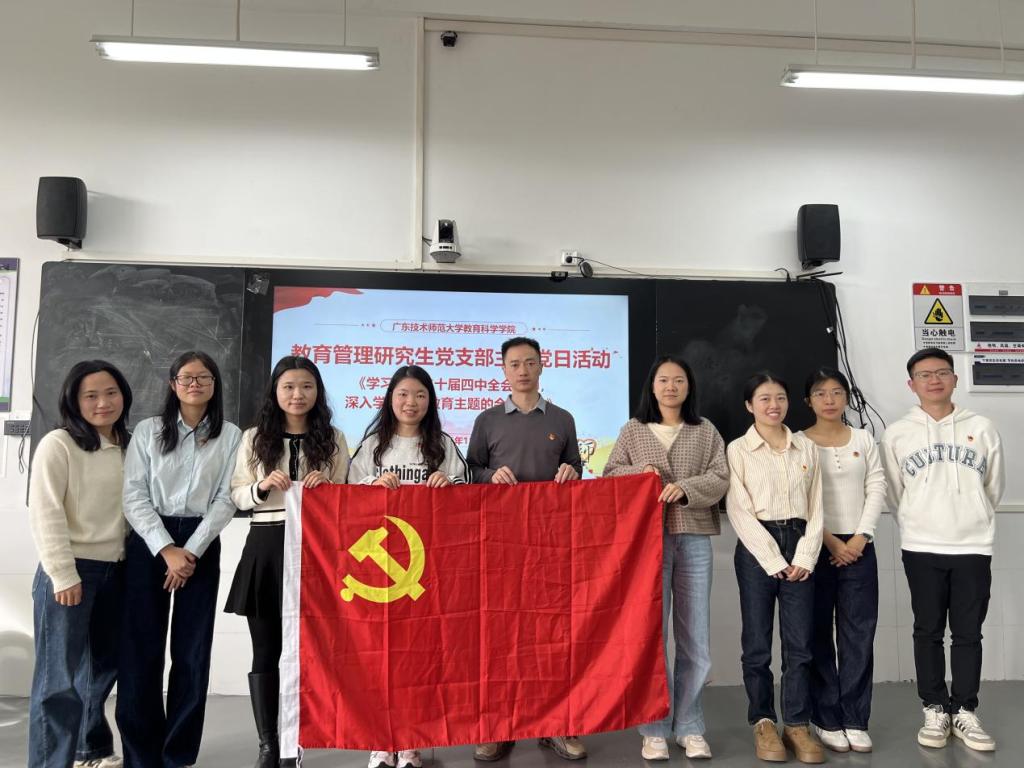 为深入学习贯彻习近平总书记视察广东重要讲话精神与党的二十届四中全会精神,推动理论学习与教育专业实践深度融合,切实强化支部党员及入党积极分子的责任担当与专业素养,11月24日上午9点,教育管理研究生党支部在白云校区第二实训楼307教室成功举办11月主题党日活动。支部全体党员出席、入党积极分子积极参与,活动由教育管理研究生党支部副书记卢凯敏同志主持,通过第一议题领学、主题研讨交流、实践经验分享三个环节,实现思想淬炼与能力提升的双向赋能。