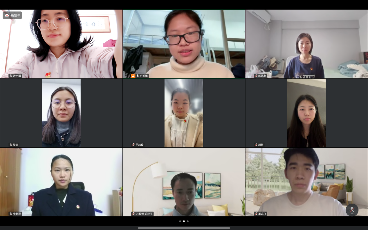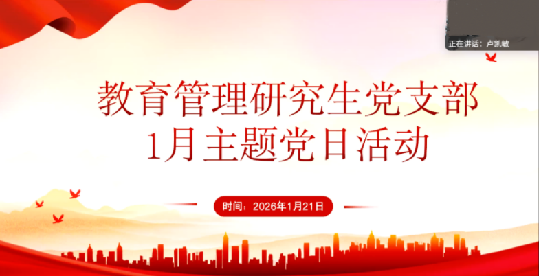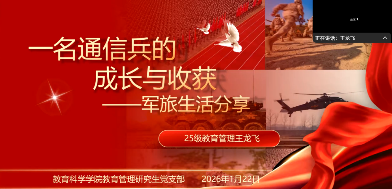 为深入学习贯彻习近平总书记新年贺词精神,强化党员及入党积极分子的使命担当,1月22日,教育管理研究生党支部以线上形式举办主题党日活动。活动融合第一议题学习与军旅生活分享两大核心环节,通过理论滋养与实践感悟的深度碰撞,为全体党员、预备党员及部分入党积极分子带来了一场深刻的思想淬炼与精神洗礼。会议由支部副书记卢凯敏同志主持。