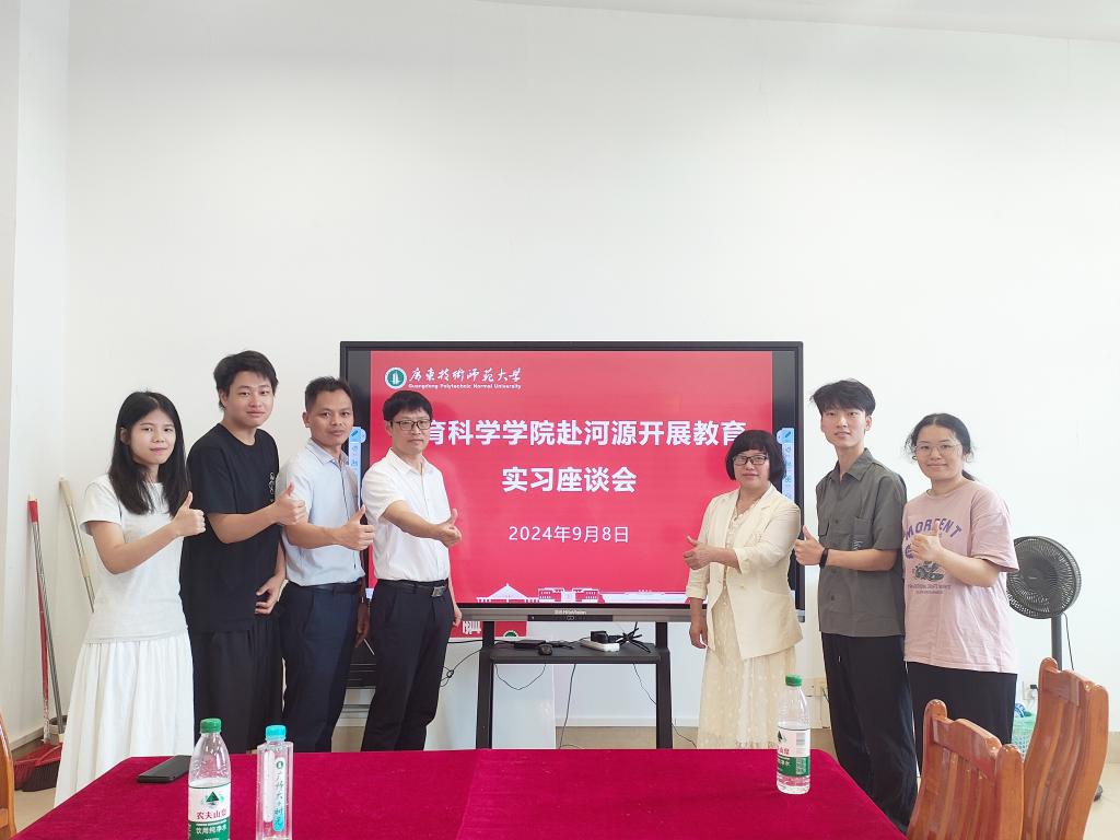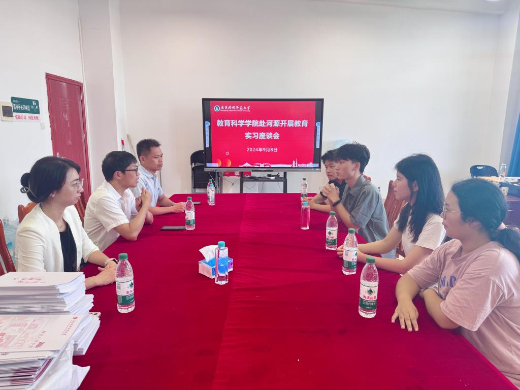 为深化教育实习实践,提升师范生专业技能,了解员工在实习基地的基本情况,BV伟德官方网站于9月8日上午赴河源市开展教育实习座谈会。教科院经理熊华军、副书记吴水爱、副经理谢德新、骆明丹老师、以及梁欢、宋米堃,唐洁,胡萍妹等4位实习生参加座谈会。会议由熊华军经理主持。