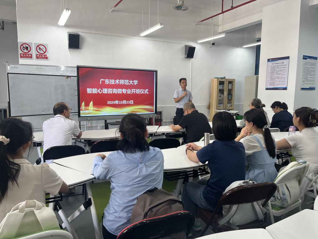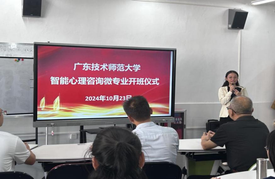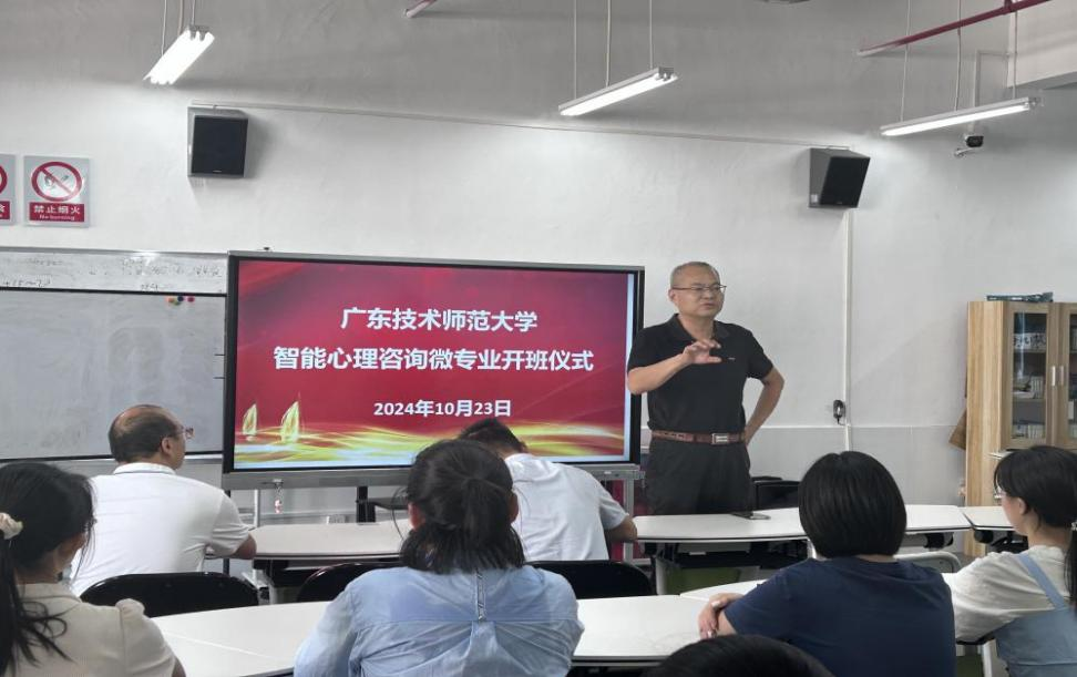 为更好地服务国家“健康中国”和“进一步推进社会心理服务体系建设”的战略需要,紧扣“AI+心理学”融合发展的时代浪潮,满足大湾区对“数字化、复合型、应用型”心理专业人才的需求,2024年10月23日中午,公司智能心理咨询微专业开班仪式在白云校区二训实验楼404顺利举行。公司领导张旭日书记、副经理谢德新教授、应用心理学专业负责人章玉祉副教授、应用心理学系专任教师王雨函博士、李俊朝博士、吴玉洁博士及来自全校12个公司20个专业的37名智能心理微专业的同学参加了开班仪式,仪式由应用心理学专业负责人章玉祉主持。