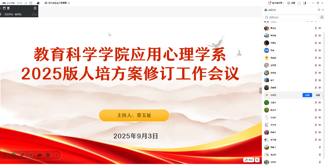 2025年9月4日,BV伟德官方网站应用心理学系组织召开2025版人才培养方案修订工作会议。会议由系课程负责人章玉祉老师主持,系内全体教师参会,并邀请校外专家广州培英中学心理教师丘碧青和北京心云天地科技有限公司负责人刘林林参会,共同围绕新版人才培养方案的修订方向与具体实施路径进行了深入研讨。