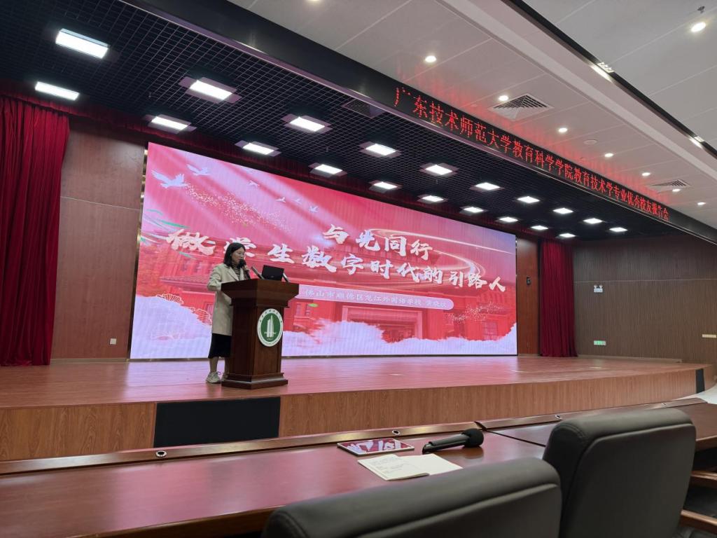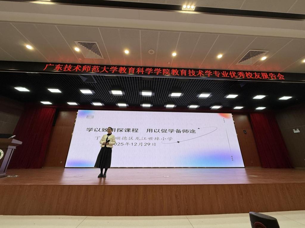 2025年12月29日,教育技术学系于白云校区图书馆113报告厅成功举办教育技术学专业优秀员工报告会。本次报告会以深化专业教育、指引员工发展为目标,邀请了佛山市龙江镇世埠小学副董事长丁玲(2014届)、龙江外国语公司骨干教师黄晓欣(2019届)两位优秀员工返校作经验分享。报告会由专业负责人梁乐明主持,教育技术学系主任赵玉与及专业骨干教师周元春、宗晓艳、蒋凡以及2022级、2023级、2024级教育技术学专业本科生和教育硕士(现代教育技术)研究生参会。