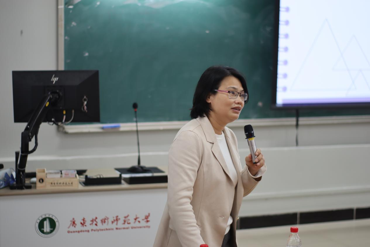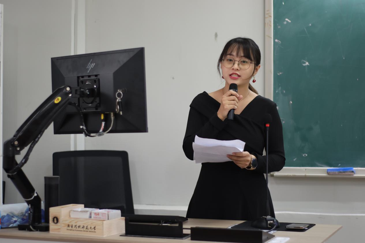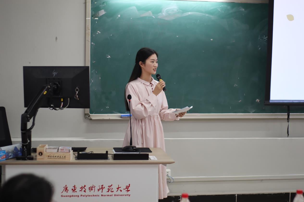 来自21教育管理专业的陈育勤同学作为实践之星代表分享了她在佛山市顺德区梁銶琚职业技术公司教育见习和实习过程中所见所闻所想所作的公司产品实践。其中讲到,公司管理有“重点”,做到“有深度、有高度、有温度”;课堂教学有“设计”,做到“见教材、见员工、见课堂”;班级管理有“方法”,做到“约规、动情、晓理、导行”。