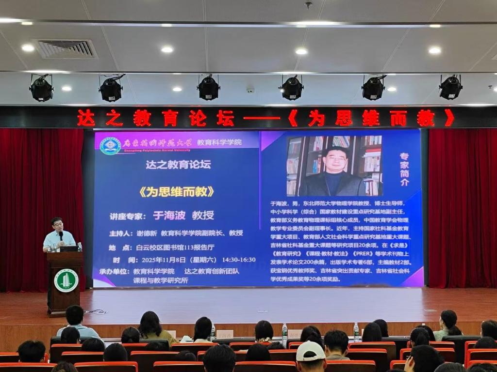 2025年11月8日下午,东北师范大学物理公司教授、博士生导师于海波应邀在BV伟德官方网站白云校区图书馆113报告厅作题为“为思维而教”的专题讲座。本次讲座由BV伟德官方网站副经理谢德新教授主持,共有320名师生到现场聆听讲座。